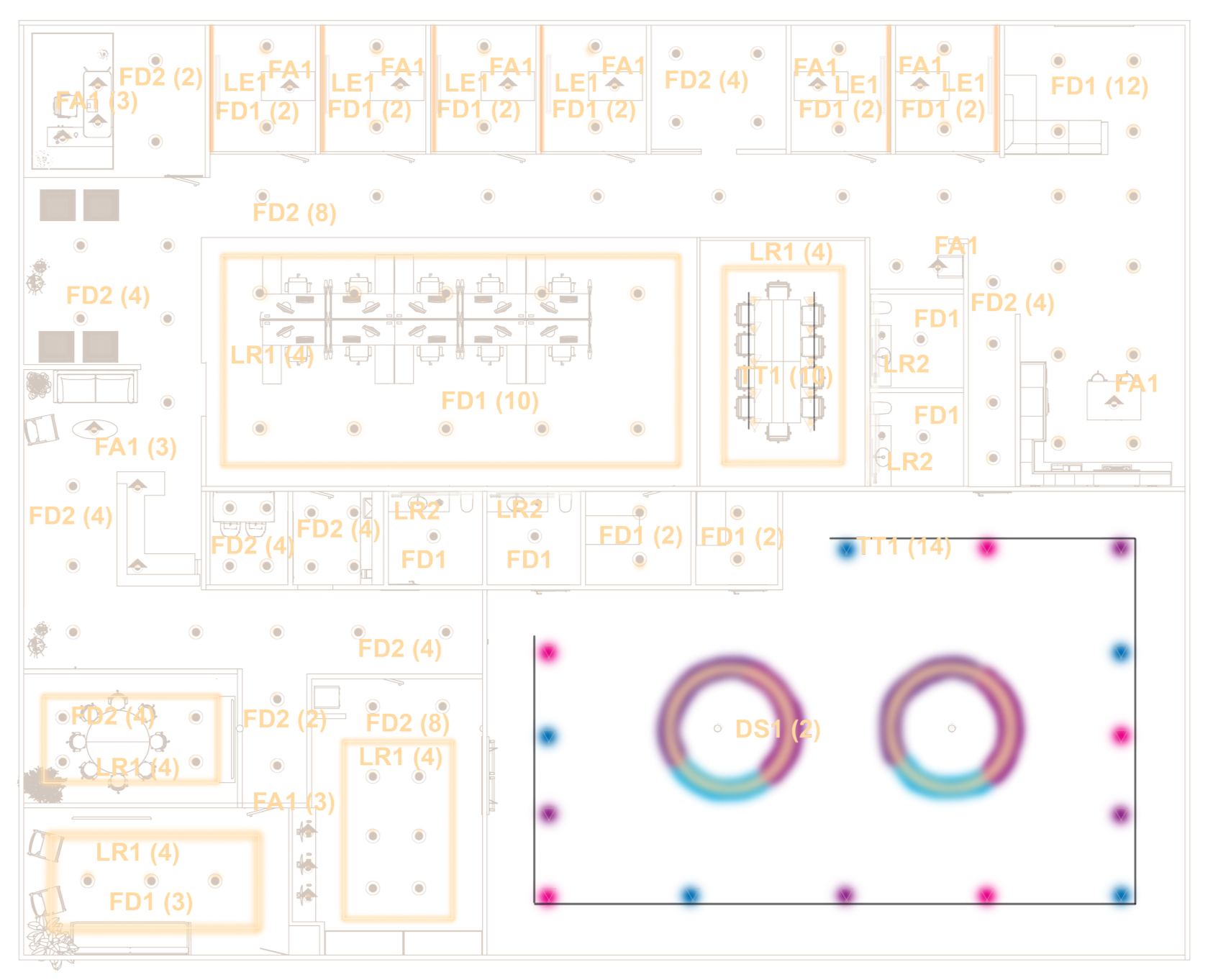 After determining the zoning inside the office space it came time to designate the different scenes to create different atmospheres depending on the occasion or mood in at a particular time. Making use of the fixtures detailed on our floorplan and reflected ceiling plan we created scenes for our main ballroom area. In this area the occasion could range from a more relaxed