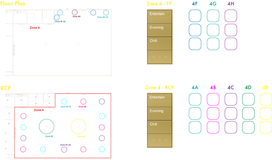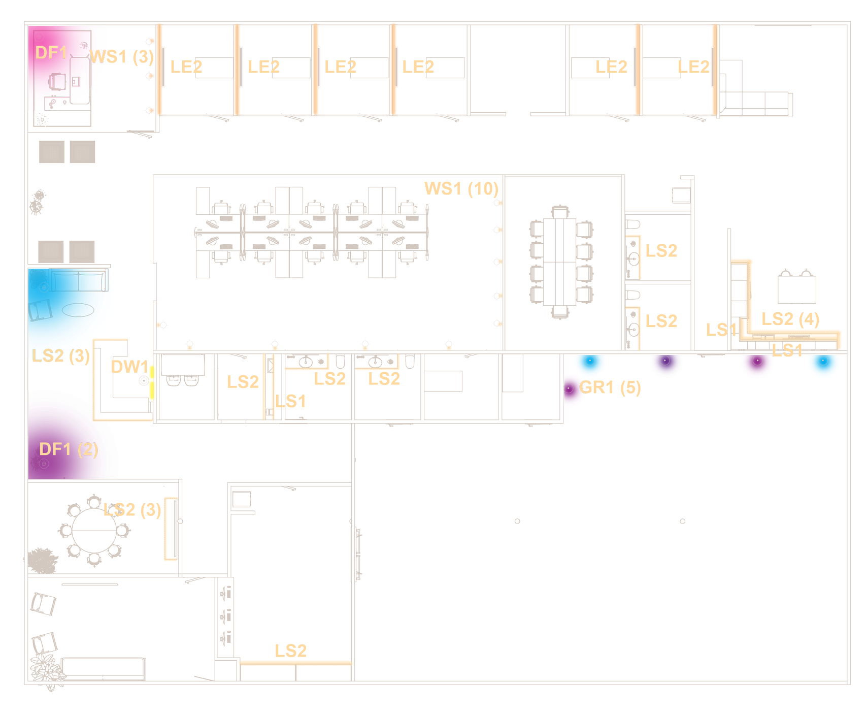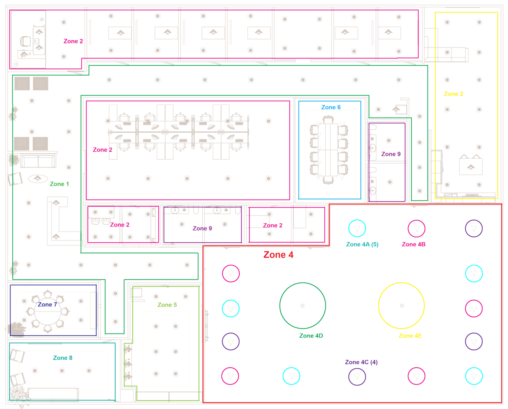 Following the creation of our floorplan and reflective ceiling plan we then needed to create zones for the individual lighting areas within our grander system. This is the purpose for coordination, lights that would be affected and adjusted separately from each other so as to open up for versatility in creating individual scenes within the office space.