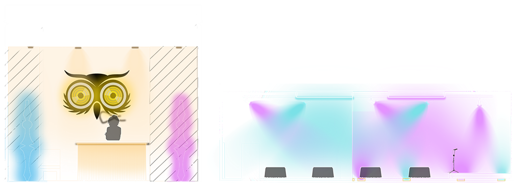 The second of these scenes shows the main ballroom during its “entertainment” setting. This portrays the energy and dynamic lighting atmosphere that would be used whenever there was an artist showcase performance.